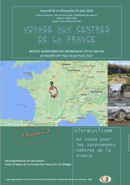 | 06/06/2026 | 1221 | CERCLE JULES FERRY CYCLO | BRM 600 – VOYAGE AUX CENTRES DE LA FRANCE | Brevet 250 Km et +/Randonneur |