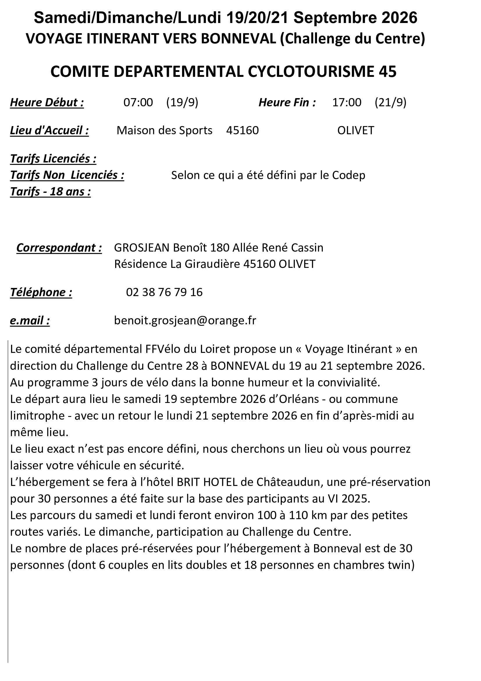 | 19/09/2026 | 0000 | CODEP DU LOIRET | VOYAGE ITINERANT VERS BONNEVAL (CHALLENGE DU CENTRE) | Randonnée/Sortie |