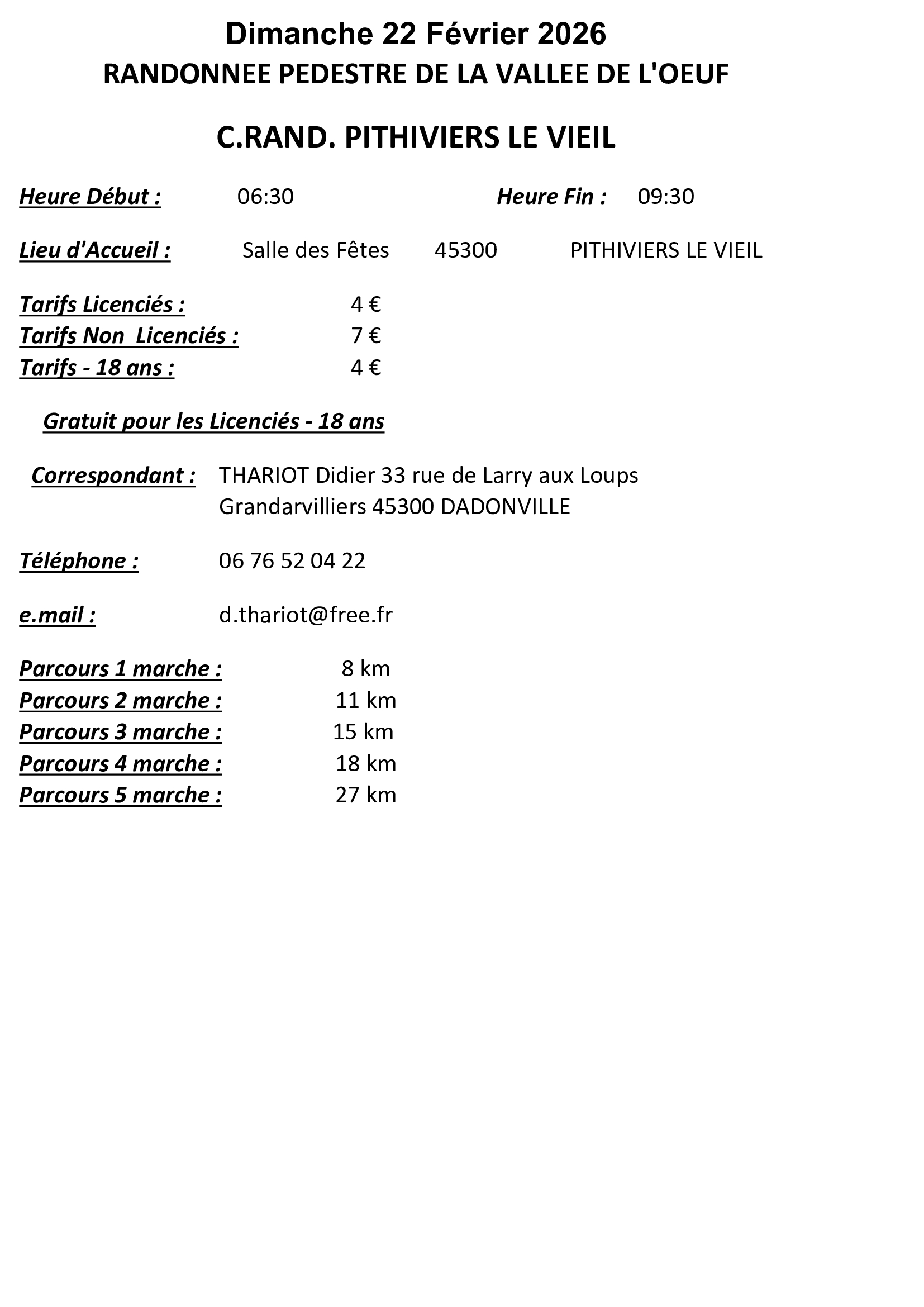 | 22/02/2026 | 4626 | C. RAND. PITHIVIERS LE VIEIL | RANDONNEE PEDESTRE DE LA VALLEE DE L’OEUF | Randonnée/Sortie |